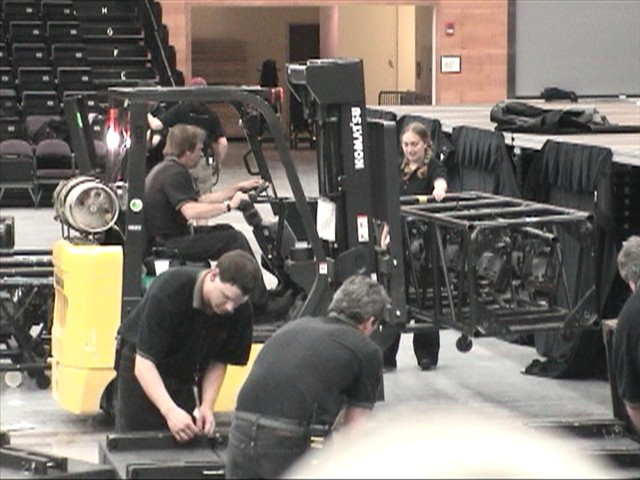 equipment to the stage. From the parking lot setup and on to